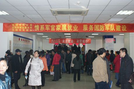 沈阳是大军区所在地,驻军部队有600多名军官家属需要就业。沈阳市民政局把为部队解决热点、难点问题作为地方拥军办实事的根本目标,秉承为国防建设和军队建设服务宗旨,热心、诚心、尽心为军官家属就业服务,以解决部队关注的家属就业这一切身利益问题为切入点,在严峻的社会就业形势下,充分挖掘社会资源,协调各方面力量,于2月27日上午,专门为全市军官家属举办了就业招聘会。