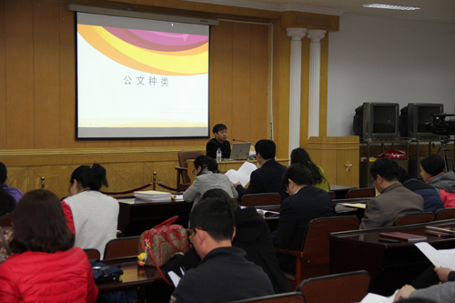培训中,市政府高阳同志以《党政机关公文处理工作条例》、《党政机关公文格式》为依据,结合工作实际,采用举实例、做对比的方式,通过播放幻灯片,围绕公文种类、公文格式、行文规则、公文要素、公文写作等内容进行了专题讲授,并针对公文处理中常见的问题进行了点评和剖析。