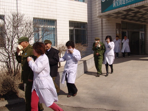 演习中每一个环节都做的井然有序,护理员利用手机第一时间向值班室报警,值班室接到报警后,马上启动消防应急疏散预案,利用消防应急广播通知各部门到病房楼进行救援。按照预案制定的报警、火灾疏散、抢险救护等各组的分工迅速展开救援。报警组,负责打119火警电话,并派人到路口迎接消防车辆,同时通知院内相关领导到场。灭火组,利用灭火器和走廊内的墙壁消火栓铺设水带,进行灭火;疏散组,利用各消防逃生通道组织人员疏散;救护组利用担架疏散不能行动的老人,并对可能发生危险的病人及时疏散救治。由于各组有序的开展救援工作,最终成功的将火灾控制在初期阶段,很好的完成了演习任务。
