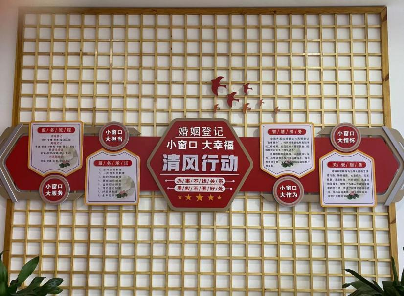 三是服务环境求突破,小窗口有大情怀。严格按照民政部婚姻登记场地创建要求,分设等候区、结婚登记区、离婚登记区、颁证大厅、婚姻家庭辅导室、档案室,为服务对象创造温馨舒适的办事环境,为离婚当事人提供独立的私密空间,保护当事人的个人隐私。服务窗口整洁如新,宣誓现场布置的神圣、庄严,增强了新人的仪式感、幸福感、责任感,引导新人在今后的岁月里携手并肩、互敬互爱、共担风雨。婚姻、婚俗板报长廊,让新人在沐浴爱河的同时,尽快转换角色,完成家庭担当。免费复印为新人减少了往返时间、节约了开支。一杯热水、一叠纸巾、一句问候,让新人心情舒畅,如沐春风。积极引入专业人员,为当事人提供情感沟通、婚育健康、心理疏导、关系修复、家庭教育、纠纷调解、法律咨询等服务。通过开展婚姻家庭辅导,打造集婚前教育、婚姻家庭矛盾调适为一体的婚姻家庭辅导体系。线上线下相融合,全力推进婚姻家庭危机干预服务。