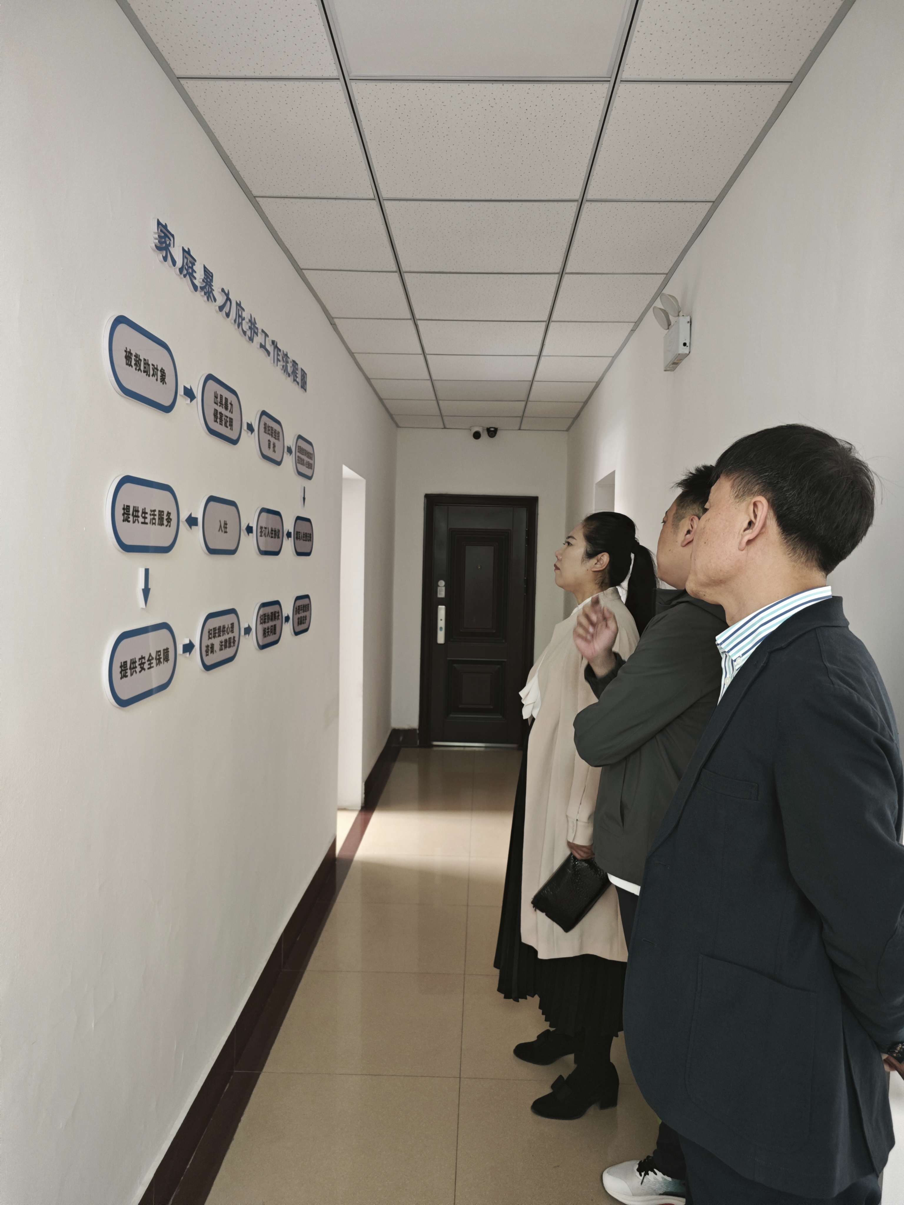 在调研过程中,张巍副主席首先前往接待大厅登记窗口,细致查阅并问询了办理家庭暴力庇护相关工作流程,随后实地到家庭暴力庇护宿舍、心理放松室、图书阅览室深入了解庇护业务的硬件设施和日常运行情况。市救助管理站副站长张士传为张巍副主席一行提供了详细的介绍和解答。