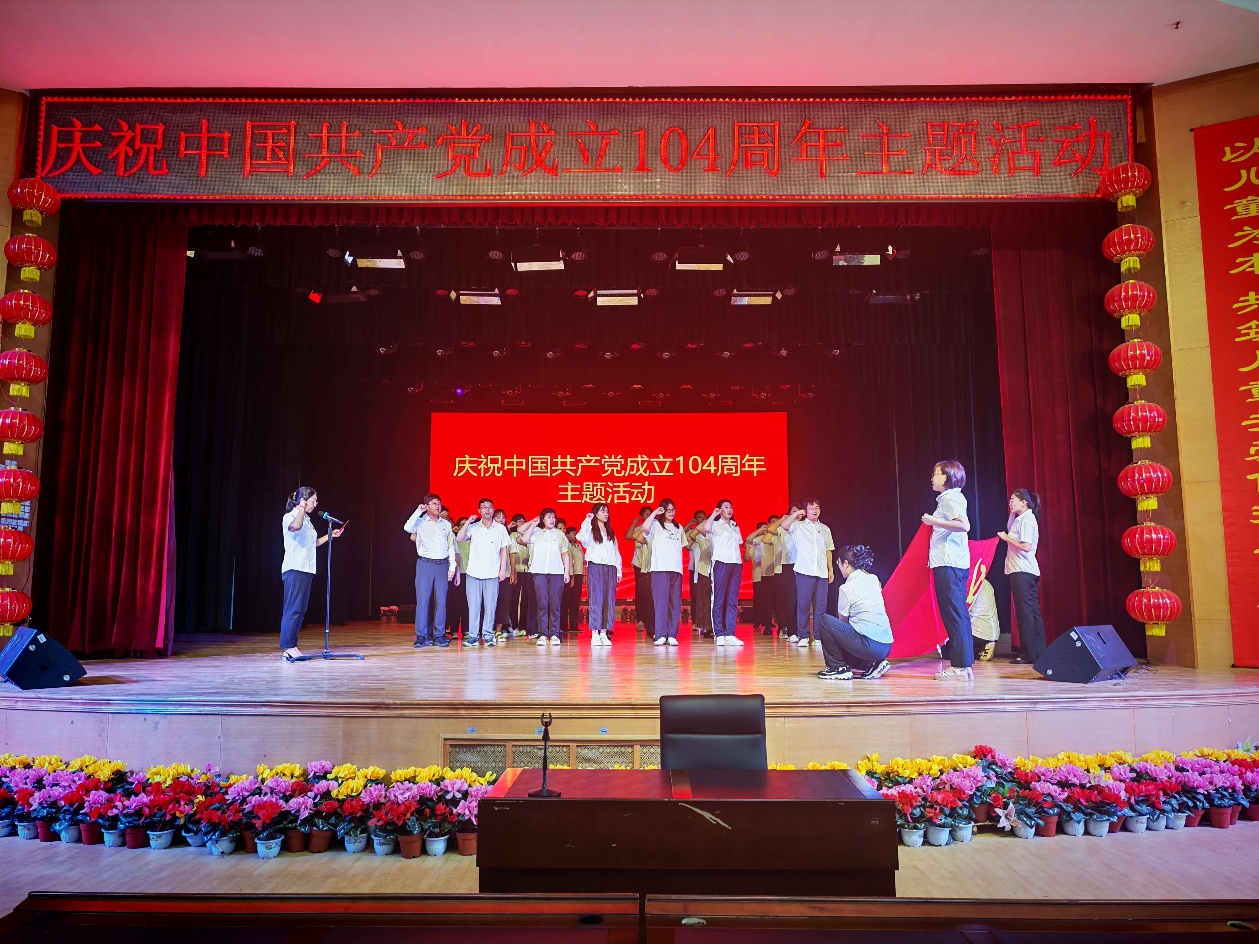 一是党课宣讲强党性,誓词重温守初心。建党纪念日当天,院党总支为庆祝中国共产党成立104周年,组织院内全体党员干部重温入党誓词、学习党课内容,并为7月份入党的党员过政治生日。活动现场,全体党员面向党旗庄严宣誓,镌刻理想信念、坚守初心使命。随后,由院党总支副书记、院长冯继红带来了一场以“铭记奋斗征程”的专题党课,以党史为切入口,深入浅出地讲解了党的奋斗之路、现阶段的赶考之路以及深入贯彻中央八项规定精神的重要性,切实以理论学习为载体,强化党性修养、夯实党建阵地。