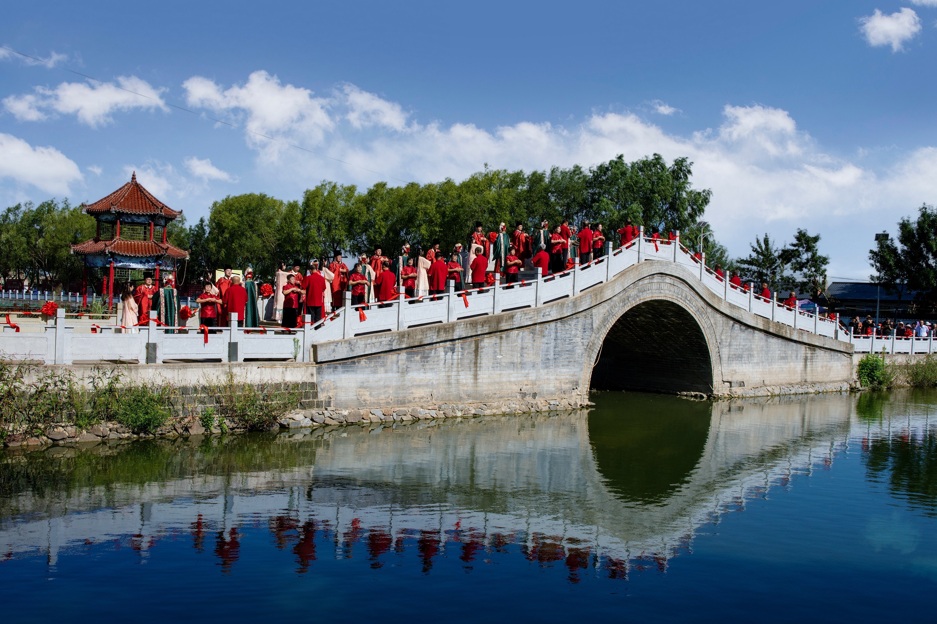 “有服章之美谓之华,有礼仪之大故称夏。”上午9时许,随着悠扬的古乐声在连心湖上空响起,婚礼仪式正式拉开帷幕。15对新人手牵红绸花缓缓入场,红绸两端的同心结在湖风拂动下轻轻摇曳,恰如新人永结同好的誓言。在礼官的引导下,新人行“三揖三让”之礼,每一次拱手弯腰都尽显华夏礼仪的庄重典雅。最令人瞩目的当数“合卺酒”环节。礼官将两只用彩线相连的宋代汝窑风格酒杯斟满美酒,新人各饮半杯后交换,一饮而尽,一仰一合的圆满姿态引得现场掌声阵阵。15对幸福长者亲临现场,把自己数十年相濡以沫的婚姻智慧、对美好婚姻的理解,化作最真挚的祝福传递下去。这份“白发传情”的温暖,不仅是对新人的期许,更是对传统家庭美德的接力。“我家里是吉林的,来到辽中已经工作6年多了,已经把辽中当成了我的第二故乡。在辽中这种集体婚礼氛围下,我感觉到辽中给年轻人提供了非常包容的、非常温暖的人文气息。作为教师,我会在学校里面好好地教书育人,我非常高兴能在辽中这里扎根,然后看着辽中越来越好,我也能跟这片土地一起成长。”新人代表刘璐笑容洋溢地说道。