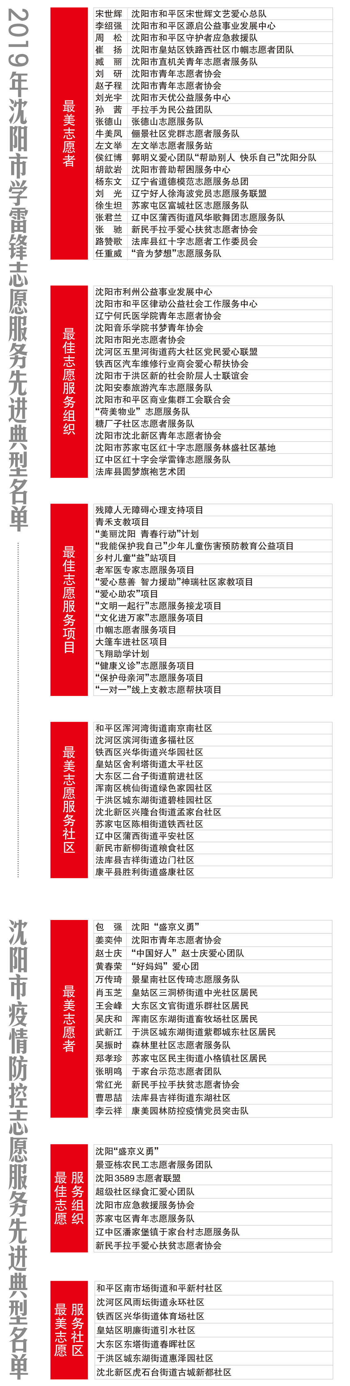 为表彰先进、激励斗志,沈阳文明委决定对志愿服务先进典型进行表彰。经各地区各部门遴选申报、资格审查、评审公示,决定授予宋世辉等21名志愿者为2019年沈阳市“最美志愿者”,沈阳市利州公益事业发展中心等16个志愿服务组织为“最佳志愿服务组织”,残障人无障碍心理支持项目等16个服务项目为“最佳志愿服务项目”,和平区浑河湾街道南京南社区等13个社区为“最美志愿服务社区”荣誉称号。同时,授予在疫情防控期间表现突出的包强等15名志愿者为“最美志愿者”,沈阳“盛京义勇”等8个志愿服务组织为“最佳志愿服务组织”,和平区南市场街道和平新村社区等7个社区为“最美志愿服务社区”荣誉称号。
