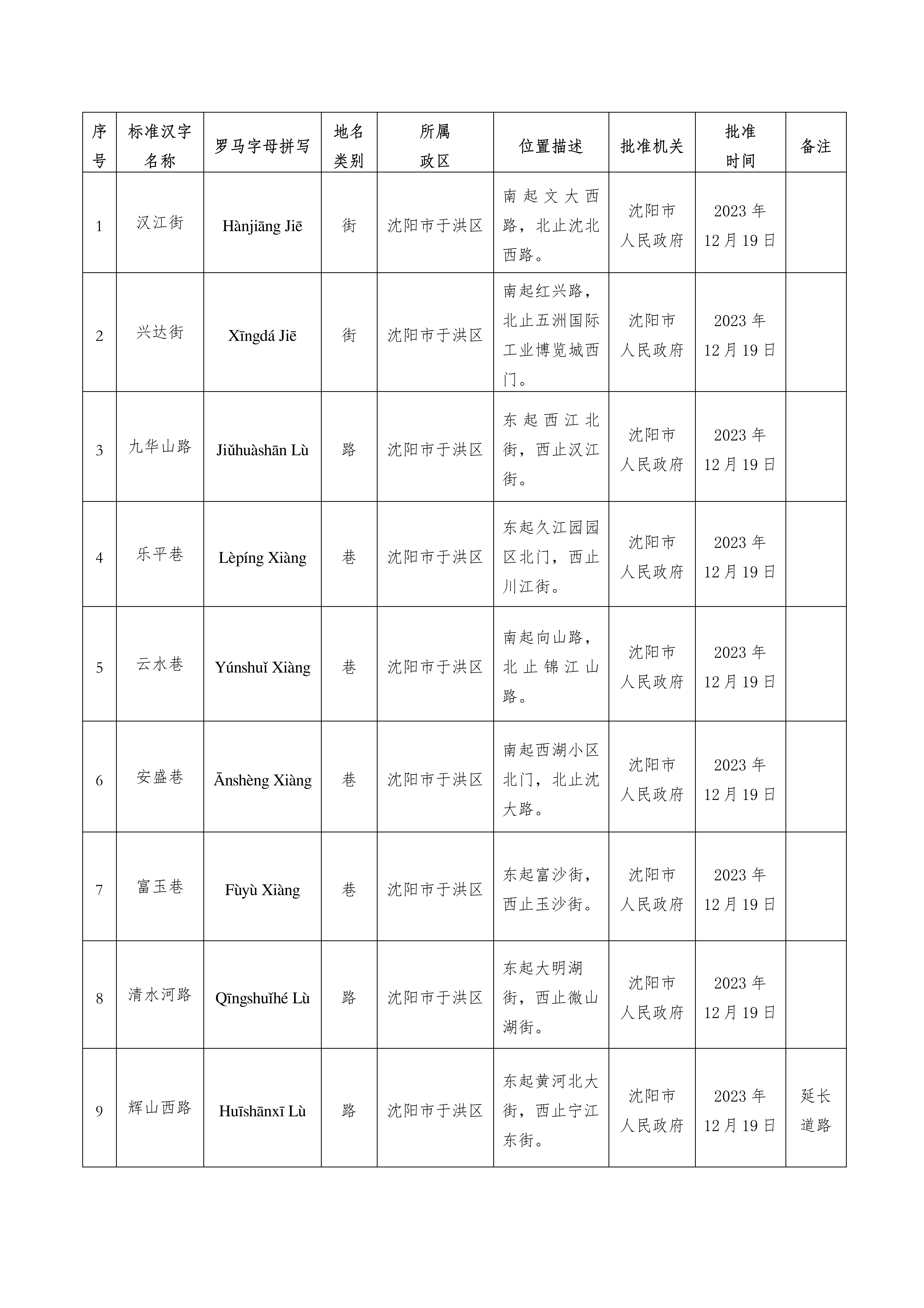 按照《地名管理条例》相关公告要求,经沈阳市人民政府批准,现将于洪区汉江街等9条道路名称命名情况公告如下: