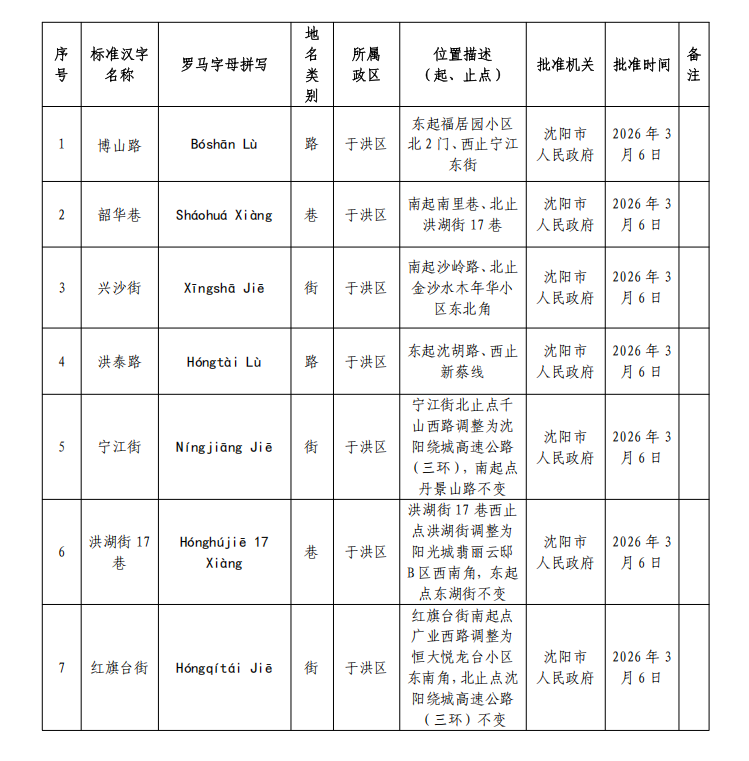 按照《地名管理条例》相关公告要求,经沈阳市人民政府批准,现将于洪区博山路等7条道路命名情况公告如下: