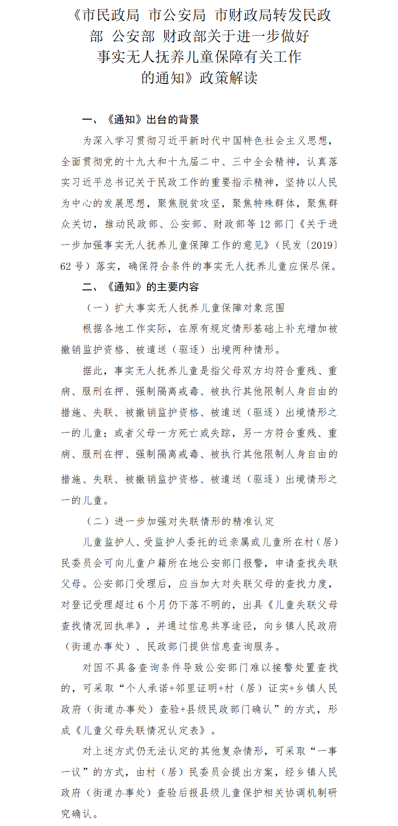 市民政局 市公安局 市财政局转发民政部 公安部 财政部关于进一步做好事实无人抚养儿童保障有关工作的通知——政策解读