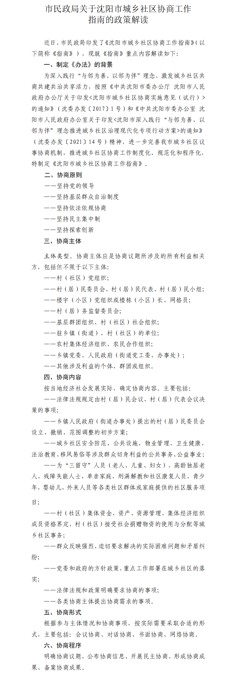 沈民发〔2021〕27号 市民政局关于印发沈阳市城乡社区协商工作指南的通知——政策解读
