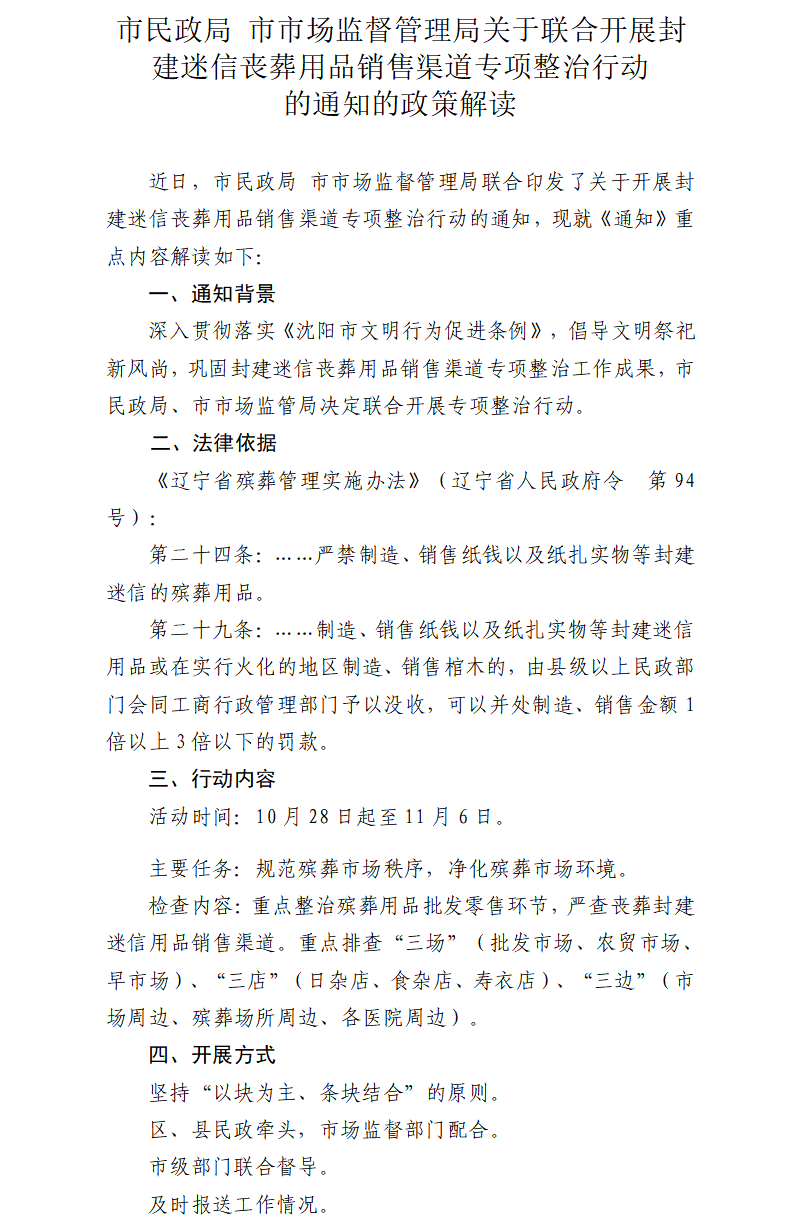 沈民发〔2021〕31号 市民政局 市市场监督管理局关于联合开展封建迷信丧葬用品销售渠道专项整治行动的通知——政策解读